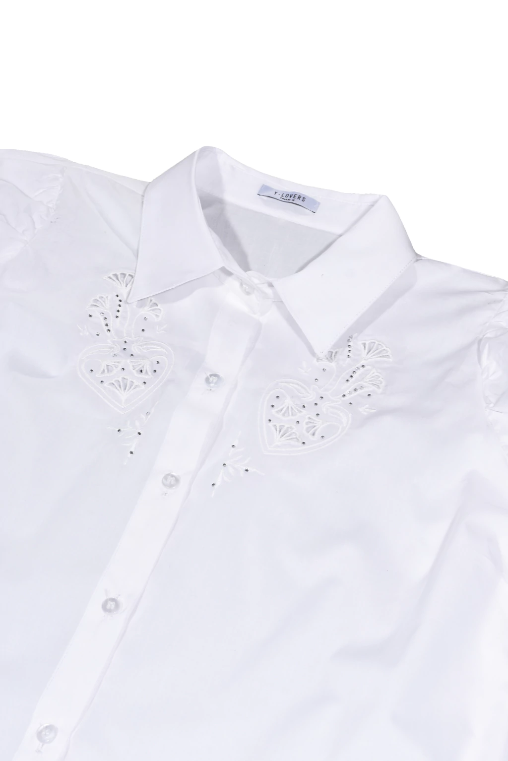 Camisa De Corte Clasico, Con Frunce En Las Mangas, Con Cartera, Cuello Y Puños Con Entretela. Confeccionada En Poplin De Algodon, Con Diseño De Bordado Y Calado En El Frente