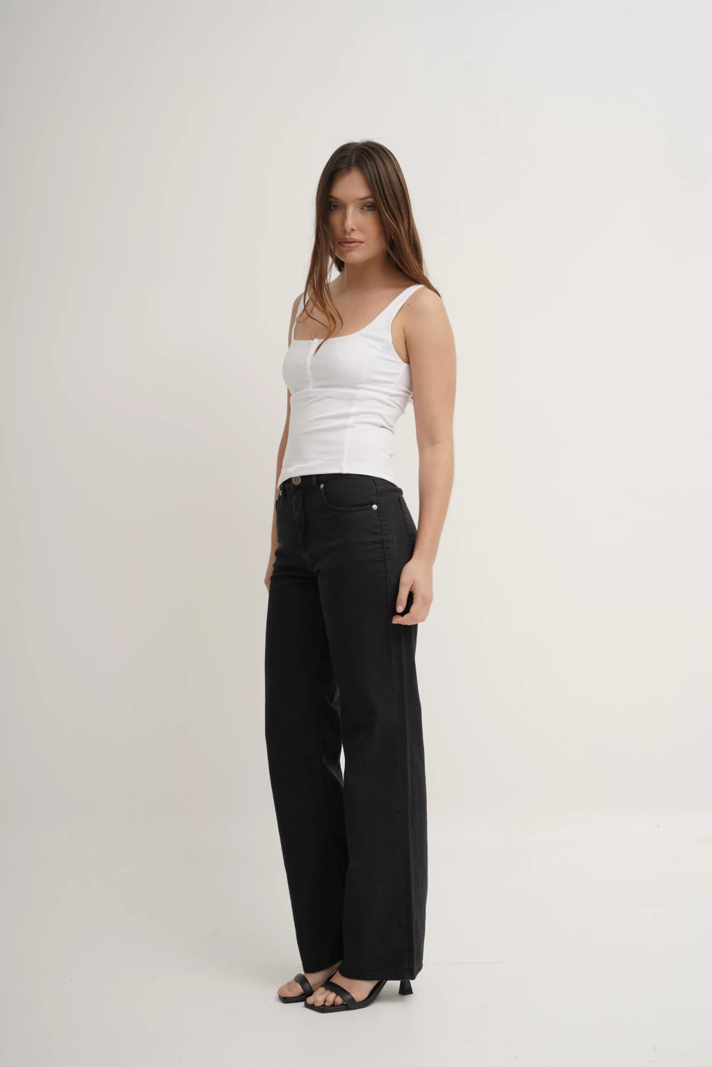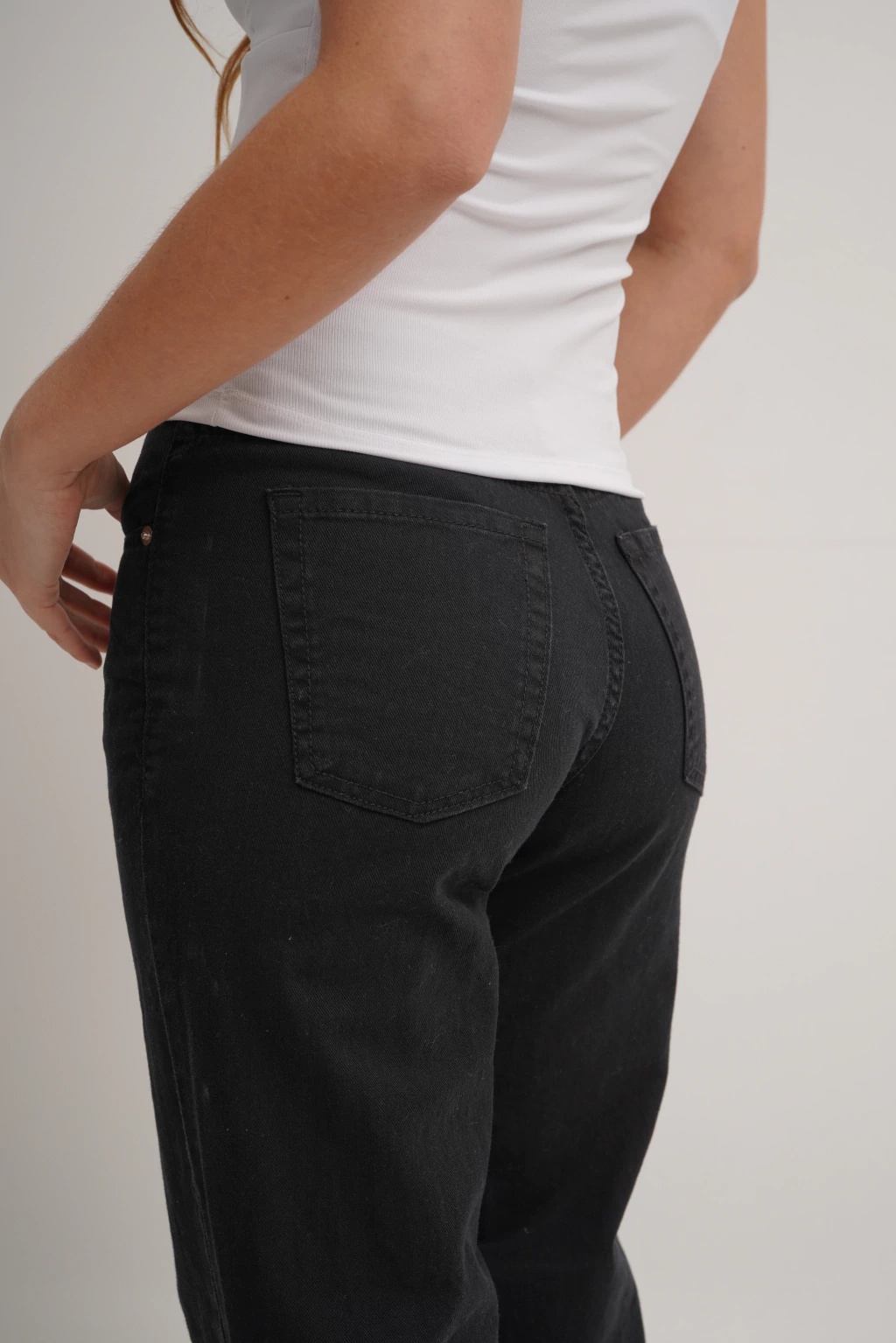 Confeccionado en denim rígido color negro, con lavado parejo, sin desgastado.