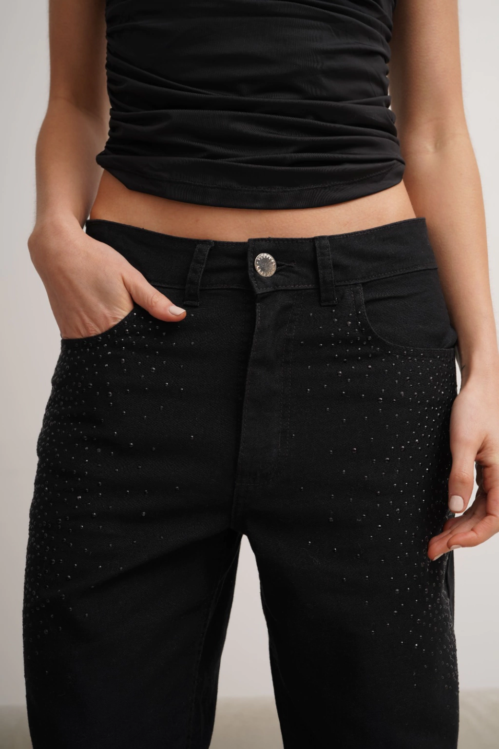 Confeccionado en denim rígido color negro, con lavado parejo sin desgastado, con diseño de strass en la parte superior e inferior, aplicado con calor.