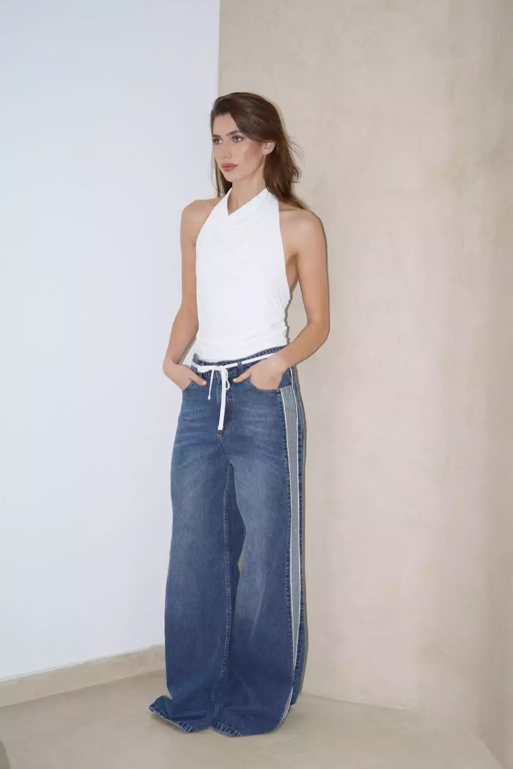 Jean wide leg tiro medio, con recortes laterales a contratono y vivos crudos en todo el largo del pantalon. Con detalle de cordón desmontable en la cintura.
