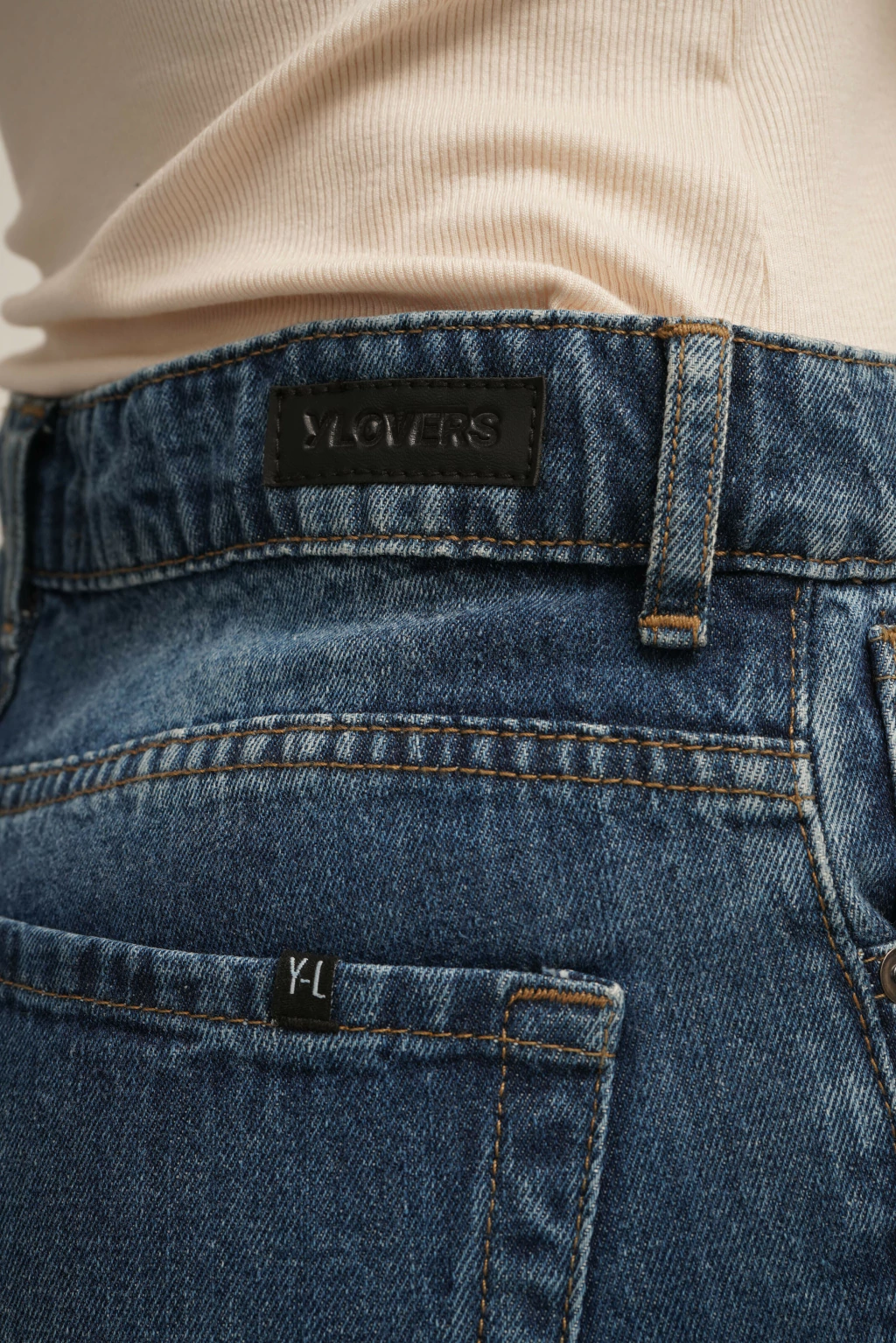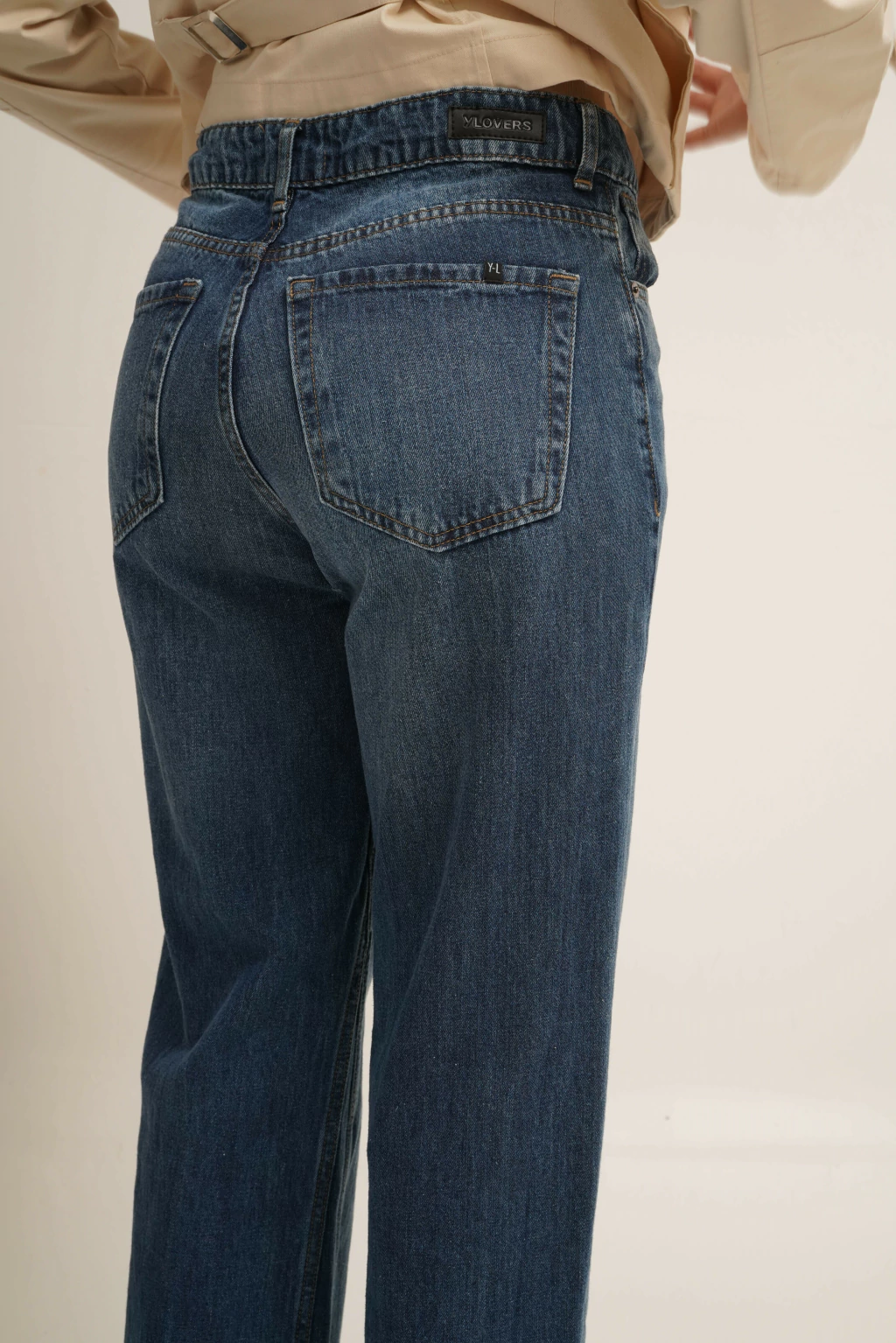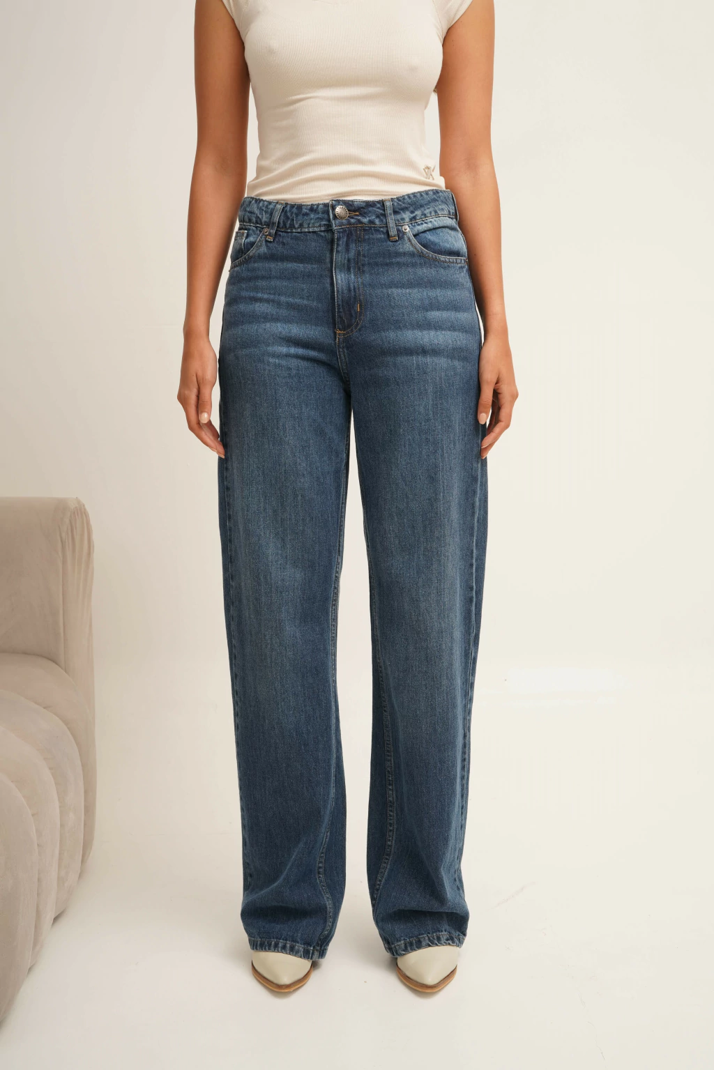 Jean Wide Leg Tiro Alto Con 5 Bolsillos Y Recorte En El Interior De La Pierna Para Mayor Amplitud. Confeccionado En Denim De Algodon Rigido, Con Lavado Azul Stonewash, Con Gastado Localizado Y Bigotes