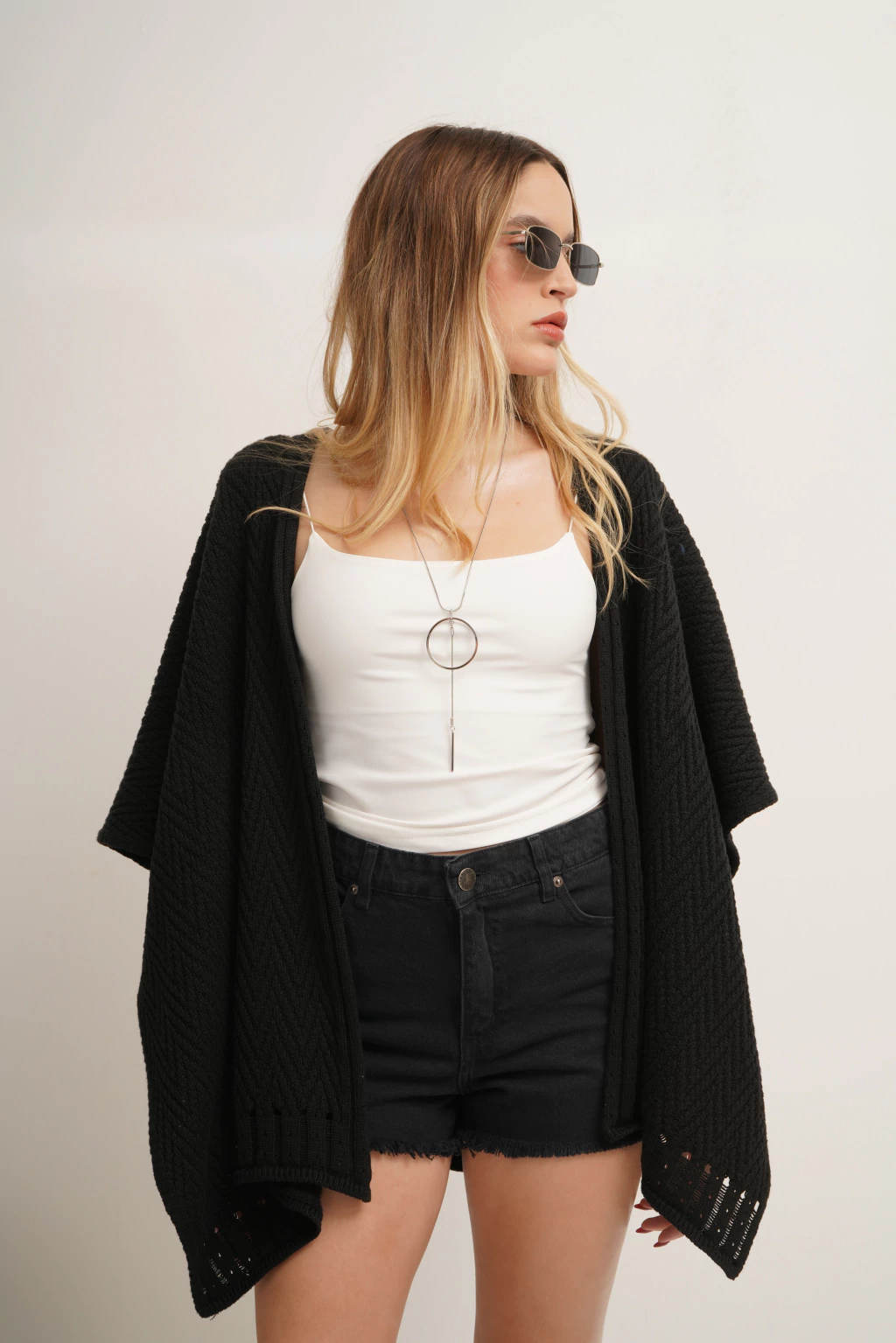 Poncho tejido con tramado zigzag y ruedo desagujado.