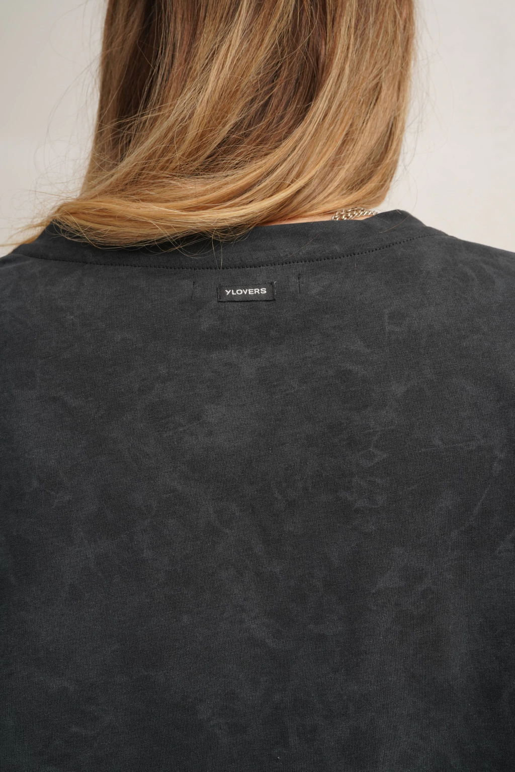 Remerón oversized de manga corta y escote redondo. Confeccionado en jersey de algodón, con teñido y gastado de estilo vintage y estampa frontal. India lleva talle S y completa el look con la bermuda Luton Black.