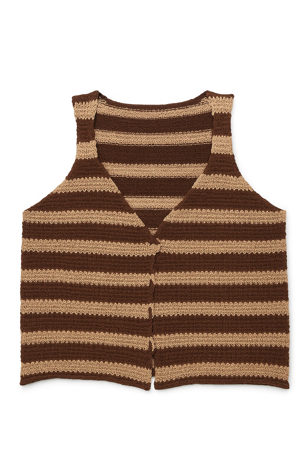 Top tejido, tipo chaleco, sin mangas, con escote en v pronunciado y broches en el frente.