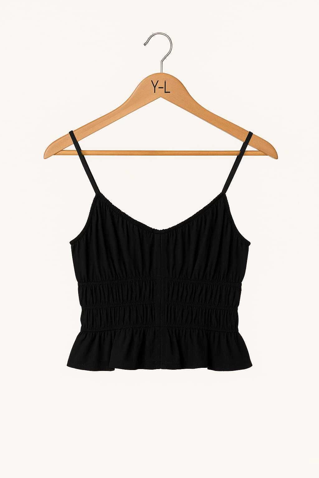 Top con elásticos fruncidos en el bajo busto, volado en la parte inferior y breteles finos con regulador.